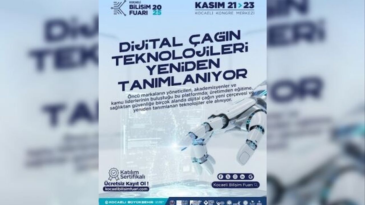 Kocaeli Büyükşehir Belediyesi öncülüğünde düzenlenecek olan Kocaeli Bilişim Fuarı, dijital çağın en güncel teknolojilerini şehre taşıyor. Yapay zeka, sanayi, eğitim, müzik teknolojileri ve akıllı şehir uygulamaları gibi alanlarda etkinlikler sunan fuar, 24 panel ve 100’ün üzerinde uzman konuşmacı ile zengin bir program sunacak. Bilişimden sanayiye, eğitimden akıllı şehirciliğe çağın teknolojilerinin yeniden tanımlanacağı Kocaeli Bilişim Fuarı, 21-23 Kasım tarihleri arasında Kocaeli Kongre Merkezi’nde gerçekleşecek.