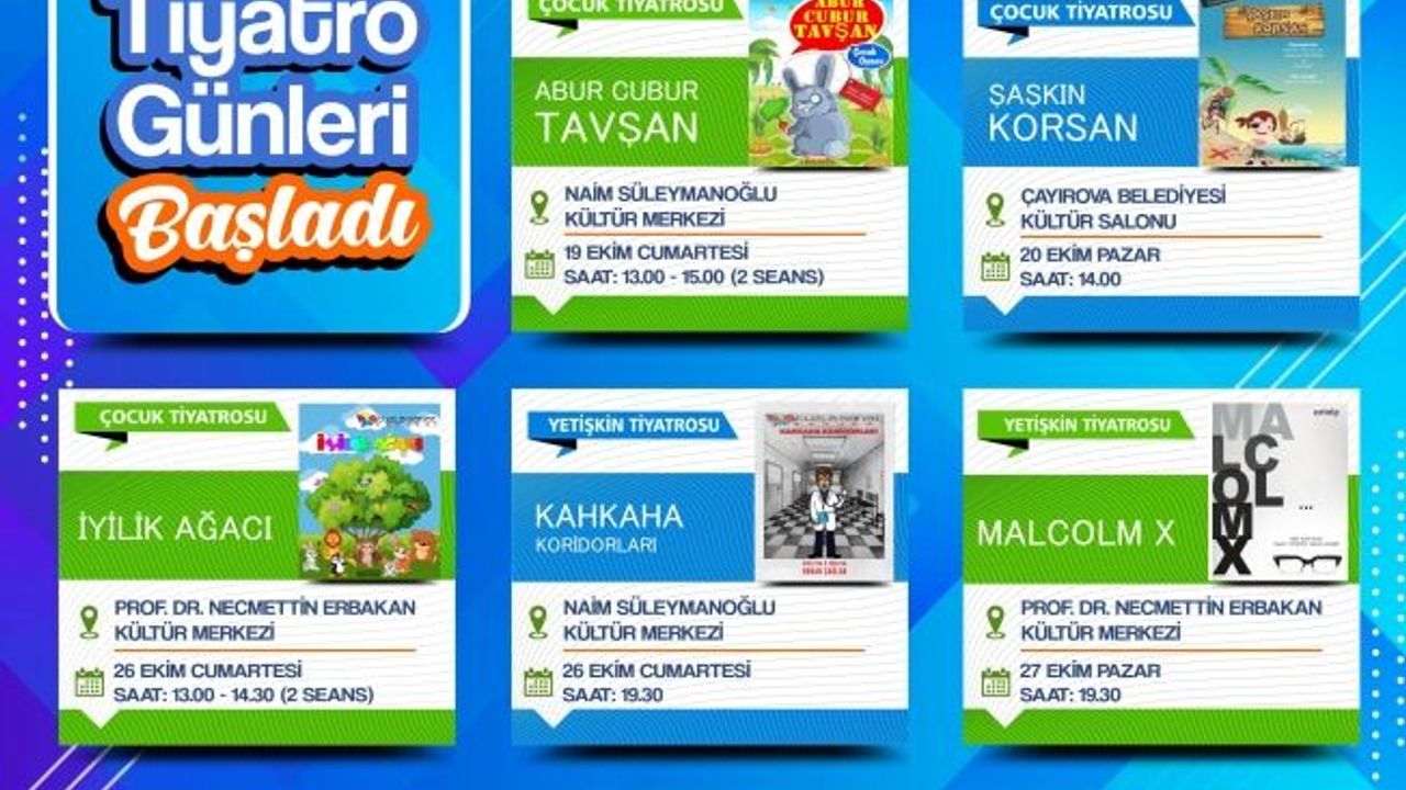 19-27 Ekim Tarihleri arasında gerçekleşecek olan tiyatro günlerinin ilk haftasında 26 Ekim Cumartesi günü Prof. Dr. Necmettin Erbakan Kültür Merkezi’nde 13.00-14.30 saatlerinde “İyilik Ağacı” isimli çocuk tiyatrosu, saat 19.30’da Naim Süleymanoğlu Kültür Merkezi’nde “Kahkaha Koridorları” isimli yetişkin tiyatrosu ve 27 Ekim Pazar günü de saat 19.30’da Prof. Dr. Necmettin Erbakan Kültür Merkezi’nde “Malcolm X” isimli yetişkin tiyatrosu sahne alacak.